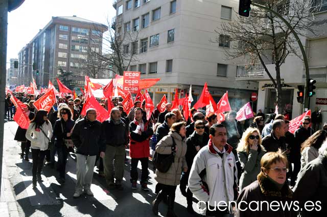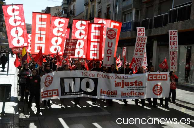 Más de  2.500 conquenses han participado esta mañana el manifestación contra la reforma laboral propuesta por el gobierno de Mariano Rajoy. Encabezados por CCOO y UGT a los que se han sumado otros muchos por el camino, han partido pasadas las 12:00 horas de la calle Mariano Catalina para protestar por la calles de la capital contra la reforma laboral, por considerar que el Gobierno facilita, abarata el despido  y aumenta la precariedad laboral con la nueva reforma laboral.