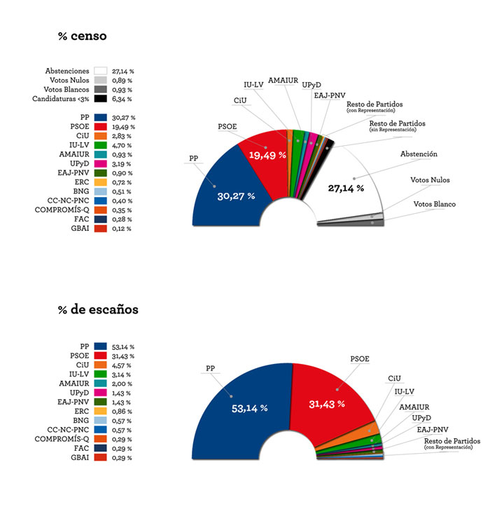 Según el partido o la provincia donde se vote, la diferencia de representación que se obtendrá es muy desigual. Tanto es así que en estas últimas elecciones, por ejemplo, CIU sólo necesitó reunir 63.391 votos por cada diputado mientras que a IU le fueron precisos 152.807 votos. Otro dato relevante que quieren aportar consiste en que el Partido Popular con tan sólo el 30,27 % del censo ocupa el 53,14% del congreso, mientras que UPyD con el 3,19% del censo dispone del 1,43% del mismo.