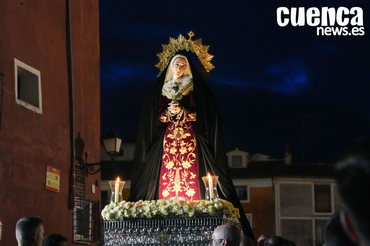 El casco antiguo de Cuenca vivió en la tarde de este sábado un emotivo Rosario Vespertino presidido por la imagen de Nuestra Señora de los Dolores, una cita que permitió recuperar el espíritu de la antigua procesión del Sábado Santo. Numerosos hermanos y fieles acompañaron el rezo del rosario por las calles medievales de la ciudad en un acto cargado de recogimiento con motivo del décimo aniversario fundacional de la hermandad. (42 visitas)Noticias relacionadas