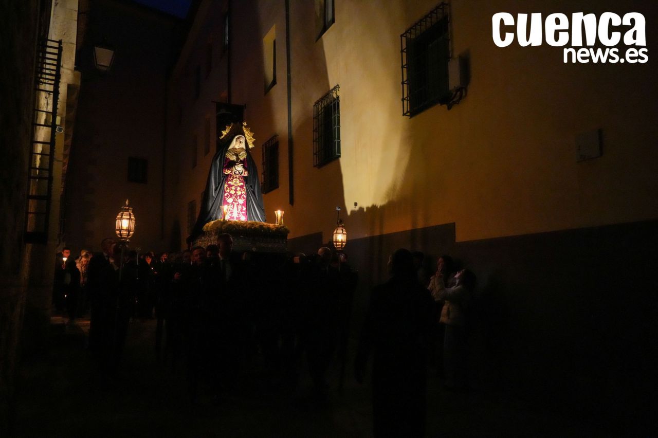 El casco antiguo de Cuenca vivió en la tarde de este sábado un emotivo Rosario Vespertino presidido por la imagen de Nuestra Señora de los Dolores, una cita que permitió recuperar el espíritu de la antigua procesión del Sábado Santo. Numerosos hermanos y fieles acompañaron el rezo del rosario por las calles medievales de la ciudad en un acto cargado de recogimiento con motivo del décimo aniversario fundacional de la hermandad. (45 visitas)Noticias relacionadas