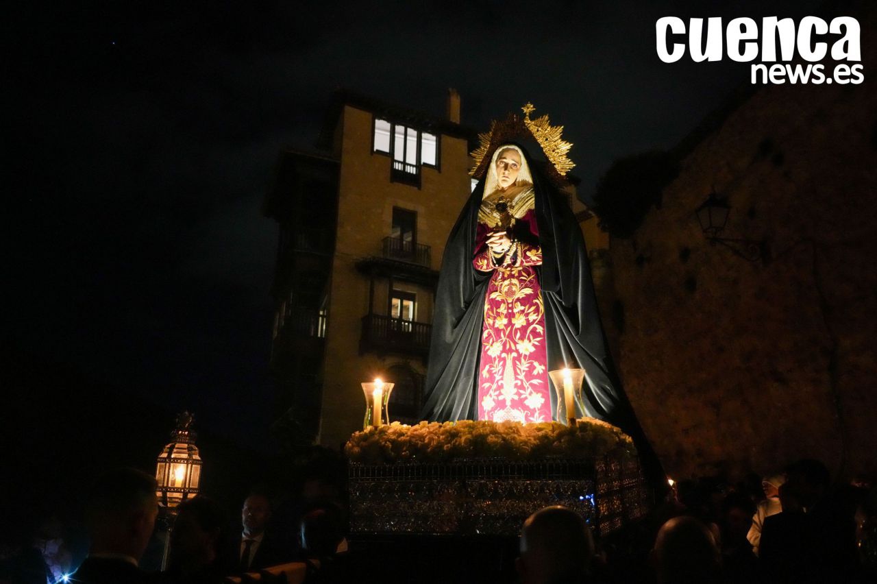 El casco antiguo de Cuenca vivió en la tarde de este sábado un emotivo Rosario Vespertino presidido por la imagen de Nuestra Señora de los Dolores, una cita que permitió recuperar el espíritu de la antigua procesión del Sábado Santo. Numerosos hermanos y fieles acompañaron el rezo del rosario por las calles medievales de la ciudad en un acto cargado de recogimiento con motivo del décimo aniversario fundacional de la hermandad. (61 visitas)Noticias relacionadas