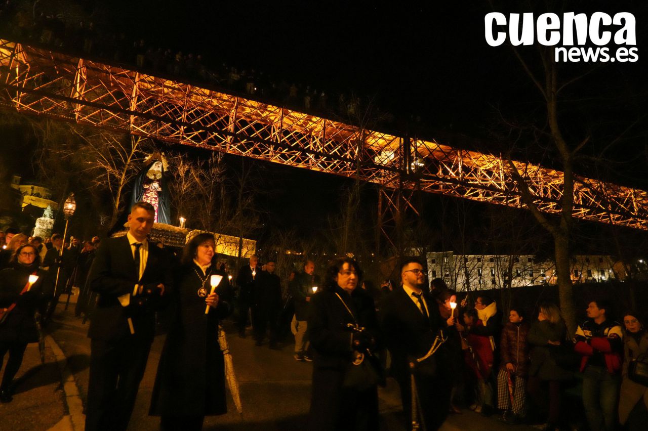 El casco antiguo de Cuenca vivió en la tarde de este sábado un emotivo Rosario Vespertino presidido por la imagen de Nuestra Señora de los Dolores, una cita que permitió recuperar el espíritu de la antigua procesión del Sábado Santo. Numerosos hermanos y fieles acompañaron el rezo del rosario por las calles medievales de la ciudad en un acto cargado de recogimiento con motivo del décimo aniversario fundacional de la hermandad. (130 visitas)Noticias relacionadas
