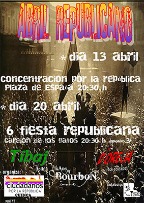 Y el viernes 20 de abril a partir de las nueve de la noche en el pub “Callejón de los Gatos” se celebrará su 6ª Fiesta Republicana con la actuación, como viene siendo habitual, de grupos musicales de Cuenca. En este caso son los grupos Tibaj (música folk), D´oreja (rock acústico) y Kaos of Bourbon (metal).
