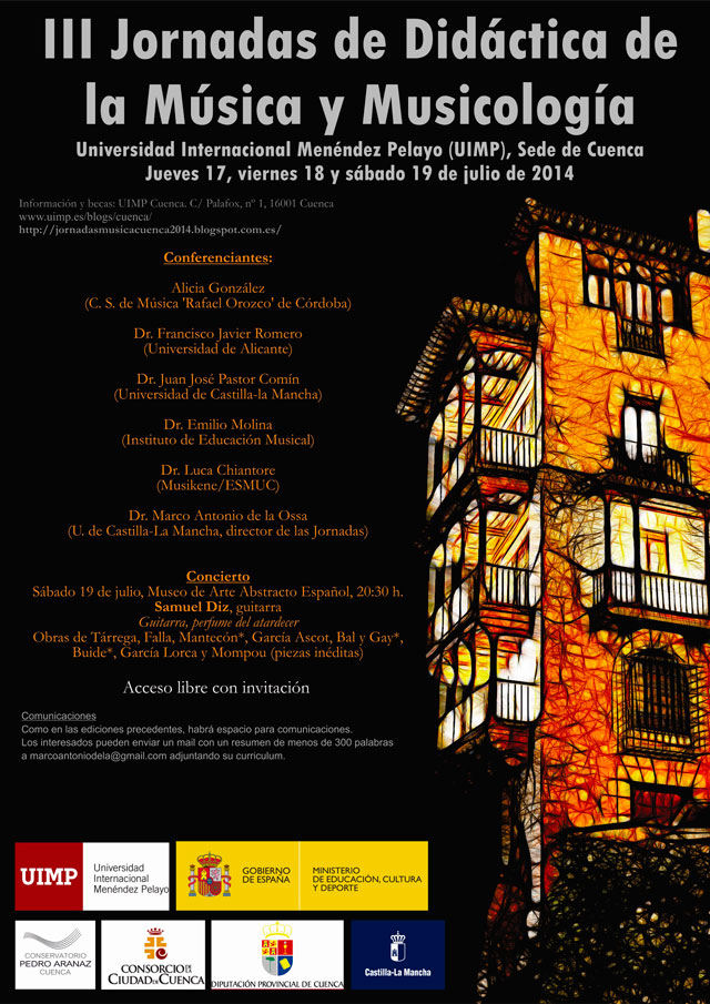 Por último, se llevarán a cabo visitas guiadas a la ciudad de Cuenca, una ruta gastronómico-musical y disfrutaremos del concierto del guitarrista Samuel Diz Sierpes, premio de la Crítica 2013 del Palau de la Música de Barcelona. Bajo el título ‘Guitarra, perfume del atardecer’, el tudense interpretará obras de Tárrega, Falla, Mantecón, García Ascot, Bal y Gay, Buide, García Lorca y Mompou, algunas de ellas inéditas, en el bellísimo marco del Museo de Arte Abstracto Español, situado en las Casas Colgadas.