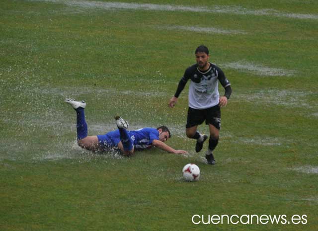 El conjunto blanquinegro lideró el partido durante todo el encuentro, pero no consiguió materializar sus ocasiones. La primera oportunidad clara sería para Cristian, quien avanzaba para quedarse solo frente al portero pero el balón se le quedó atrás por culpa del agua y el defensor le robó el balón. Diez minutos más tarde llegaba la segunda gran opción del Conquense, en la que el Villarrubia casi marca un gol en propia puerta, pero el larguero y el portero evitaron el gol. Con el empate a cero inicial se llegaba al descanso.