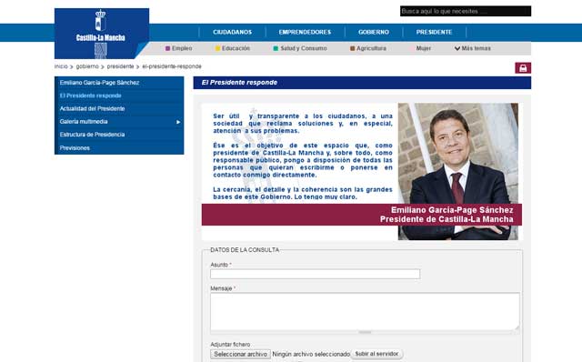 De esta manera, y a través de un sistema muy accesible al que se accede a través de la sección del Presidente en la web www.castillalamancha.es, los y las ciudadanas que lo deseen podrán hacer una consulta, sugerencia e incluso reclamar o solicitar reuniones al presidente rellenando un sencillo formulario.