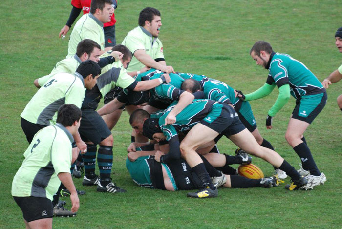 El choque comenzó relativamente relajado, y quizás fuera esa la razón por la que el combinado conquense recibió el primer ensayo en contra en el minuto 3, transformación incluida. Pasados unos minutos el Castellón conseguía aprovechar una superioridad por la banda derecha para lograr otro ensayo, esta vez sin transformación (0-12). El conjunto verdinegro reaccionó a partir de este segundo ensayo y empezó a trenzar jugadas peligrosas y a mantener la posesión del balón. Prueba de ello fue la eléctrica jugada protagonizada por los tres cuartos a la salida de un ruck, donde Lopezosa entregó a Fran el ensayo en bandeja, que sería transformado (7-12). Pero la emoción del momento se vio truncada instantes después. Pantxo fue placado antes de poder sacar rápido un golpe de castigo, y desgraciadamente el jugador del Castellón calló encima de su pierna derecha. El resultado fue una grave lesión para el 9 local: una luxación de tobillo y fractura de tibia y peroné. El apertura visitante vería la tarjeta amarilla por el placaje a destiempo. Por otro lado el “A Palos”, lejos de hundirse en la desolación, sacaba su mala sangre para arremeter una y otra vez contra la defensa rival que estuvo encajonada en su 22 bastantes minutos. El esfuerzo daría sus frutos, y tras relanzar a sus tres cuartos, Lopezosa le daba la asistencia a Luján, que ensayaba en la esquina derecha con el tiempo cumplido. Sin lograrse la conversión, el luminoso llegaba al descanso con empate (12-12).
