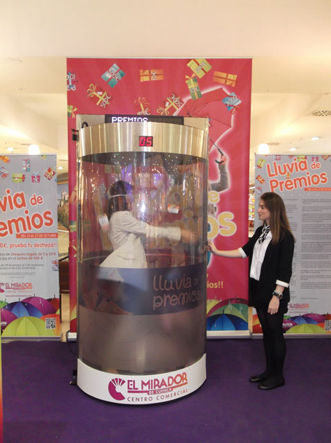 Esta ‘cabina de premios’ es la cabina de aire de Lluvia de premios, en la que los clientes entran y tienen la oportunidad de coger al vuelo una de las papeletas que sobrevuelan a su alrededor para canjearlas por tarjetas regalo con importes de 50 y 100 euros, que se entrega directamente, o bien hacerse con las papeletas de participación en el sorteo de los 300 euros finales. “Este año hemos optado por reducir el premio del sorteo de 500 a 300 euros y aumentar los premios directos hasta los 50 y 100 euros, para hacer la participación diaria mucho más atractiva y no sólo esperar al premio final”, explica la gerente del Centro Comercial El Mirador.