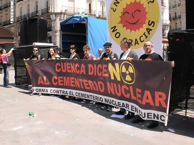 Los miembros de la Plataforma desplegaron la pancarta donde se podía leer "Cuenca dice no al cementerio nuclear", coreando lemas en contra de la implantación del silo nuclear en Villar de Cañas y por el cierre progresivo de las centrales nucleares.