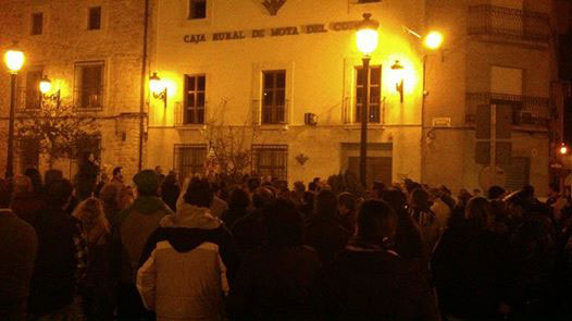 Ya por la tarde, la Plataforma había convocado a todos los vecinos de Mota socios o clientes, a sus asociaciones y colectivos y a toda la comarca a participar en una concentración pacífica aprovechando el cumplimiento del mes de la intervención y venta de la cooperativa de crédito.