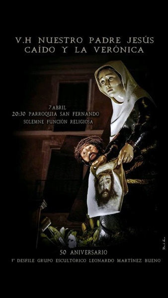 La Venerable Hermandad de Nuestro Padre Jesús Caído y la Verónica celebra los 50 años de desfile del conjunto escultórico gubiado por Leonardo Martínez Bueno y lo conmemorará el próximo 7 de abril, jueves, con un sencillo acto consistente en una solemne Función Religiosa en honor a sus sagradas imágenes.
