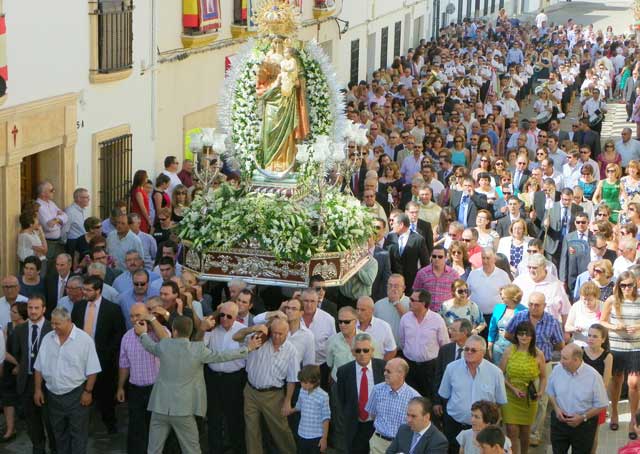 Una hora más tarde y bajo un sol radiante se producía la salida de la patrona de todos los moteños/as, que a hombros de sus anderos y con sus mejores galas volvía a cruzar el portón de la iglesia bajo los acordes del Himno Nacional.