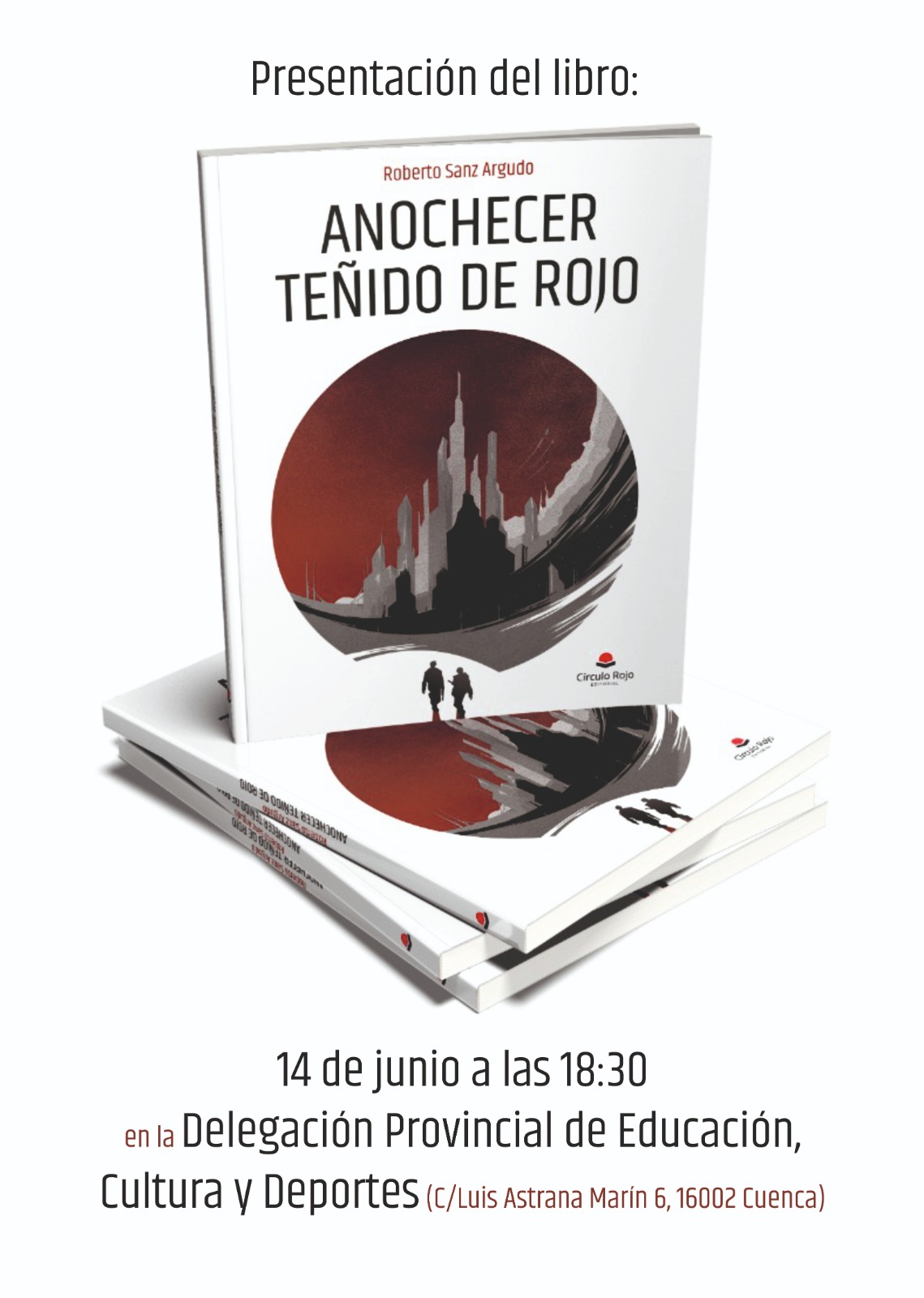 "Anochecer teñido de rojo", una novela del conquense Roberto Sanz Argudo que nos transporta a un futuro marcado por la IV Guerra Mundial, será presentada el 14 de junio a las 18:30 en la Delegación Provincial de Educación, Cultura y Deportes de Cuenca. En este libro, los protagonistas Mateo y Eki se enfrentan a desafíos en un mundo caótico, buscando la verdad y la esperanza en un entorno devastado.
