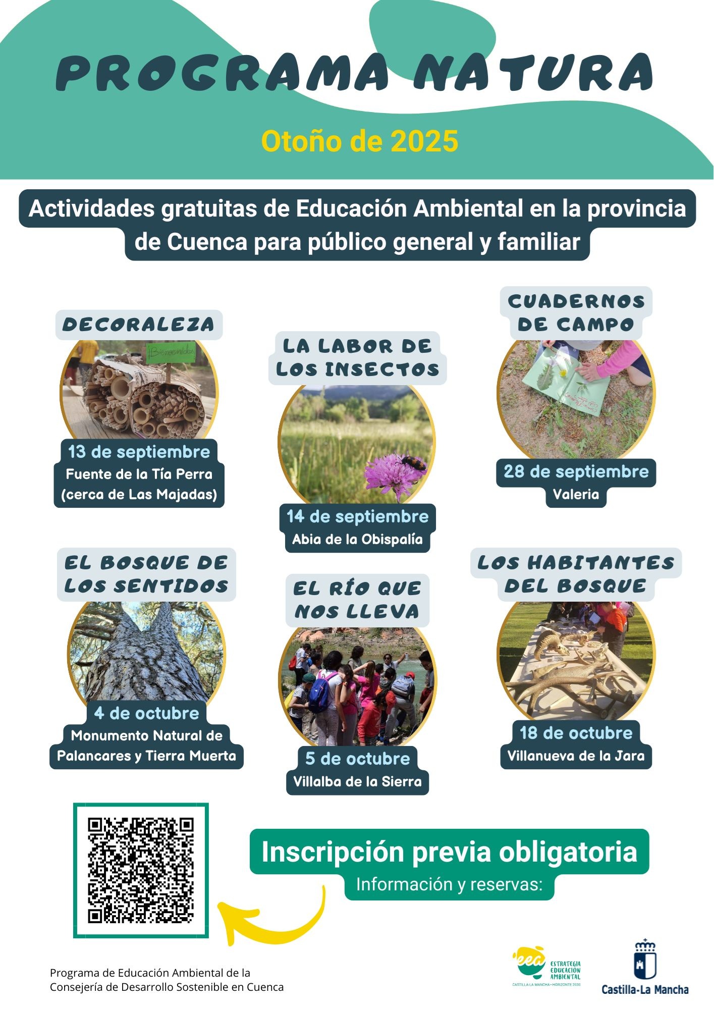El programa comenzará el 13 de septiembre en el área recreativa Fuente de la Tía Perra, en Las Majadas, con la actividad “Decoraleza”, que combina arte y naturaleza siguiendo el legado de Gustavo Torner, permitiendo a los participantes crear obras con materiales del entorno. Al día siguiente, 14 de septiembre, en Abia de la Obispalía, se celebrará “La labor de los insectos”, un recorrido interpretativo sobre la importancia de estos pequeños seres para la polinización y el equilibrio de los ecosistemas, que concluirá con un taller de construcción de refugios para insectos.