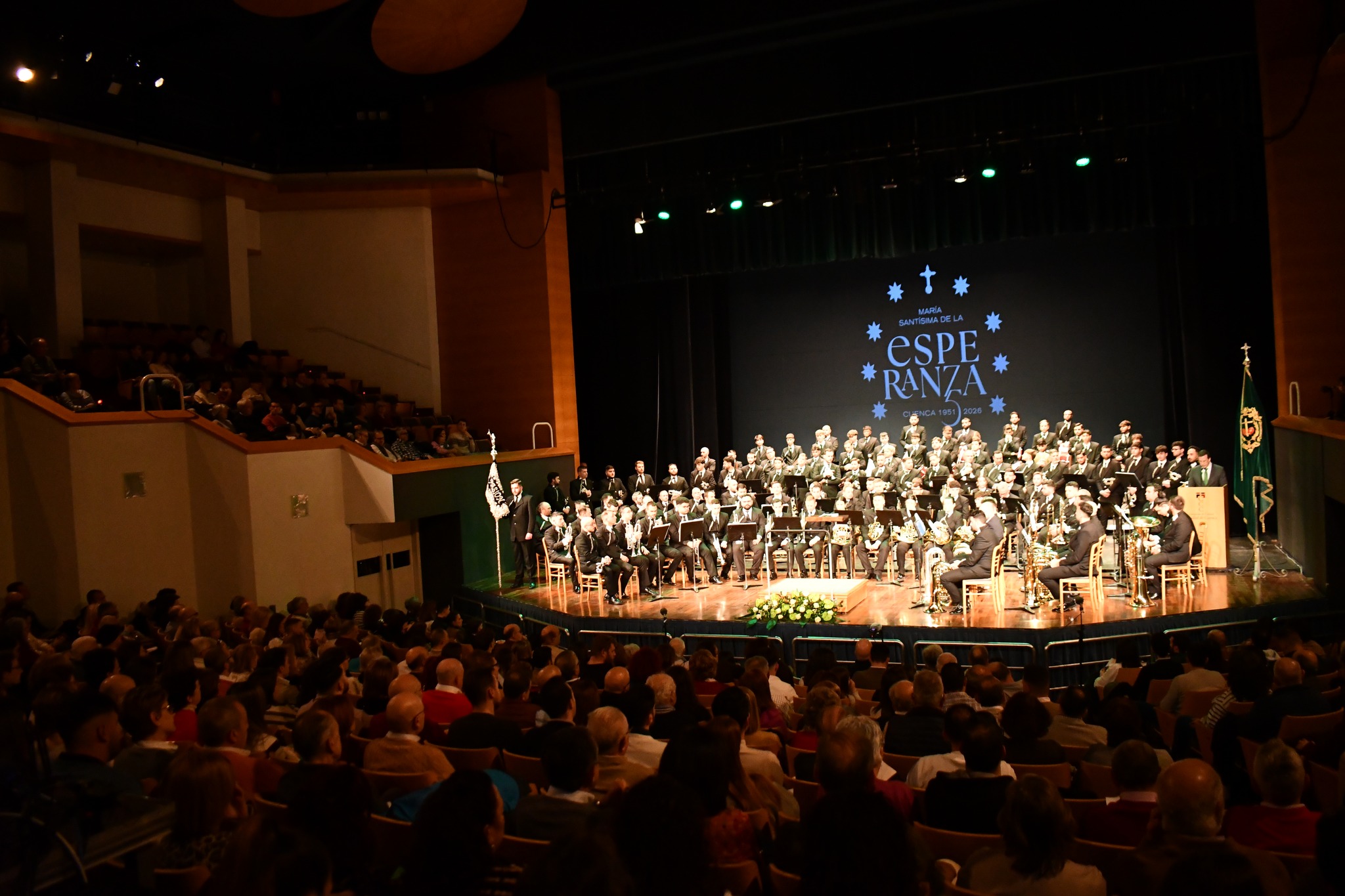El Teatro Auditorio de Cuenca acogió un concierto muy especial dentro de los actos conmemorativos del 75º aniversario de la Venerable Hermandad de María Santísima de la Esperanza. La cita contó con la actuación de la prestigiosa Agrupación Musical Nuestro Padre Jesús de la Pasión, que ofreció por primera vez en Cuenca un programa centrado en la música procesional.