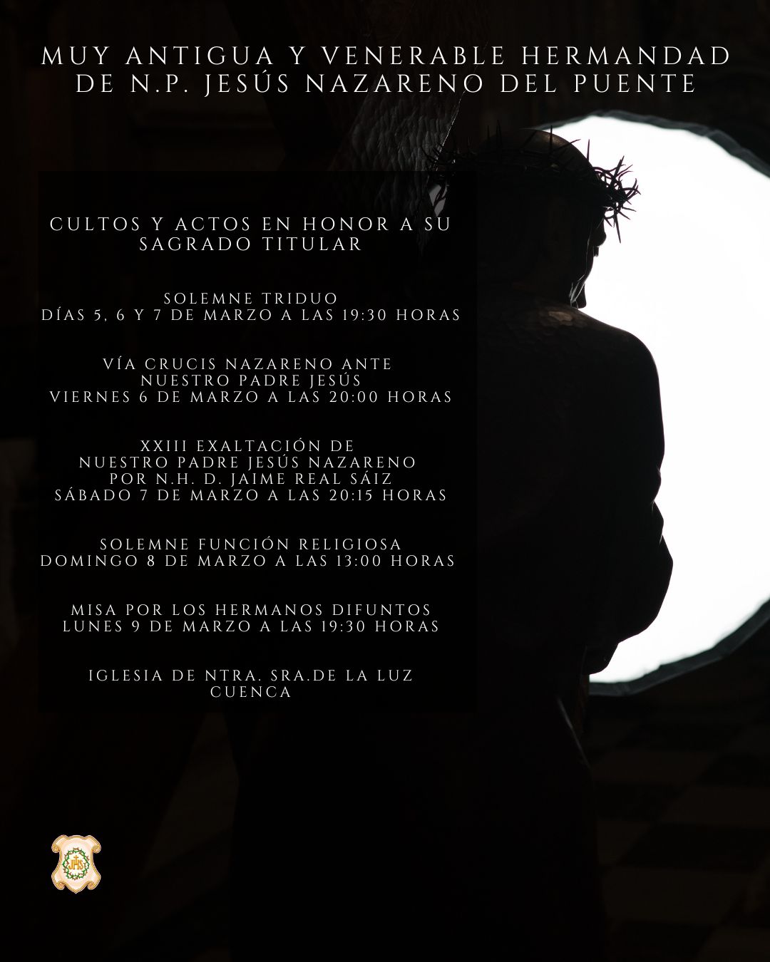 Desde la hermandad han animado a todos los hermanos y a los conquenses que lo deseen a participar en estos actos, concebidos como un espacio de encuentro, meditación y preparación antes de la esperada salida procesional de la imagen durante la madrugada del Jueves Santo.