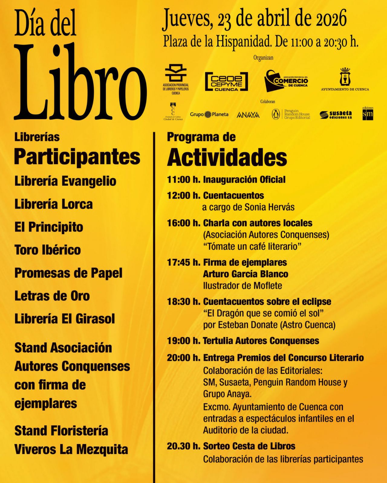 Durante diez horas, el centro de la ciudad se llenará de libros, descuentos y actividades para todos los públicos, en una jornada que busca fomentar la lectura y dinamizar el comercio local. Un total de diez stands conformarán la feria, con la participación de siete librerías conquenses —Evangelio, Lorca, El Principito, Toro Ibérico, Promesas de Papel, Leras de Oro y Librería El Girasol—, además de una floristería, la asociación de autores locales y un espacio dedicado a actividades infantiles y ludoteca, junto a un pequeño escenario para las distintas propuestas culturales.