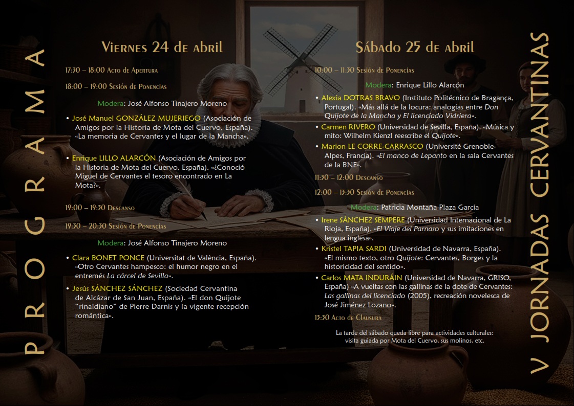 La Asociación de Amigos por la Historia de Mota del Cuervo, junto con el Grupo de Investigación Siglo de Oro (GRISO) de la Universidad de Navarra y el Excmo. Ayuntamiento de Mota del Cuervo, organizan este año las V Jornadas Cervantinas “Juan Haldudo” en la Villa Cervantina de Mota del Cuervo, durante los próximos días 24 y 25 de abril, en el centro cultural La Tercia Real de Mota del Cuervo.