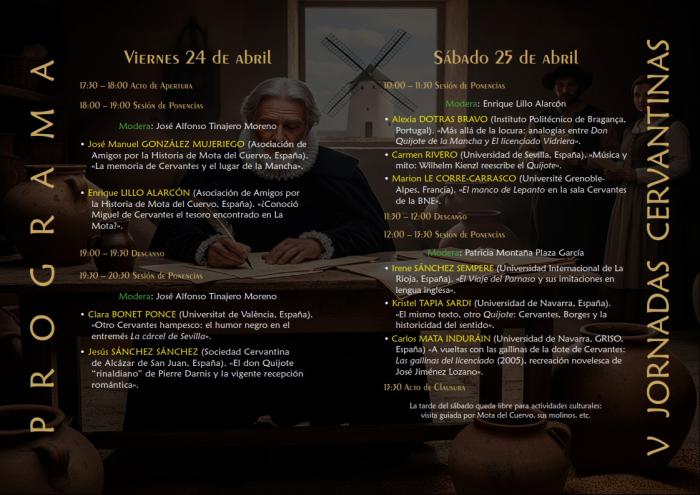 Este año, el lema de las jornadas es “Cervantes renace en La Mota” donde los distintos ponentes venidos de diferentes partes de Europa, ahondarán en diversos aspectos de la obra de Miguel de Cervantes Saavedra autor, entre otros, de la mundialmente conocida obra “D. Quijote de La Mancha”. Este año, continuamos con un enfoque internacional de las jornadas, contando con varios cervantistas de renombre, venidos en esta ocasión desde Francia, Portugal y, claro está, de diferentes instituciones de España, que disertarán durante las dos jornadas sobre el tema de este año, y que mostrarán al público diferentes puntos de vista de las obras de Cervantes, y el entorno histórico y geográfico que le llevó a escribir sus obras.