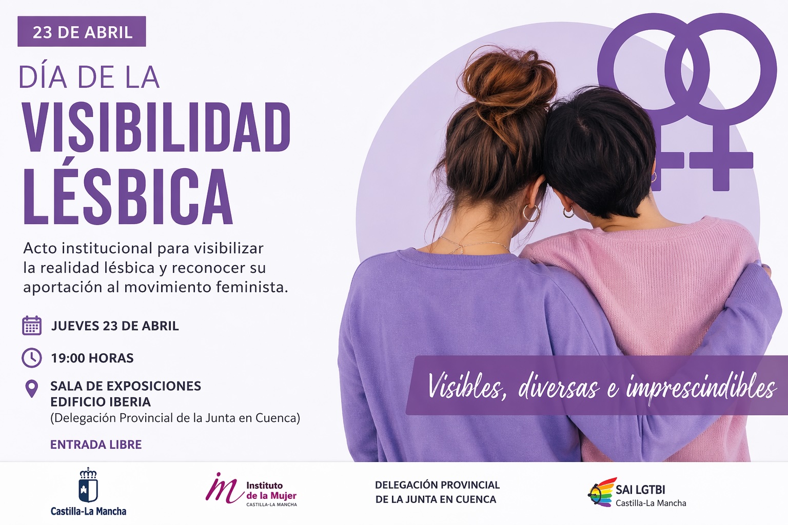 El Gobierno de Castilla-La Mancha conmemorará este jueves, 23 de abril, el Día de la Visibilidad Lésbica con un acto institucional que se celebrará en la sala de exposiciones del Edificio Iberia a las 19:00 horas, con entrada libre.