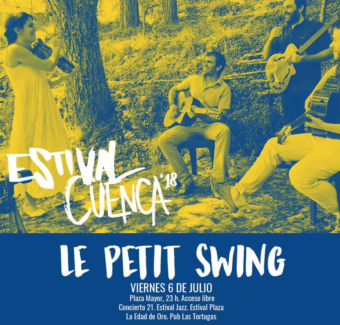 A las 23:00 horas llegará el turno de Le Petit Swing. Desde la Plaza Mayor, el grupo conquense formando por Jimena Villegas (viola), José Luis Yubero (guitarra acústica), Rafael Pérez (guitarra acústica) y Andrés Gabaldón (bajo acústico) ofrecerá su repertorio con ritmos de swing, jazz, rock de temas clásicos junto a adaptaciones y composiciones actuales. Colaboran con la actuación los establecimientos de La Edad de Oro y Pub Las Tortugas.