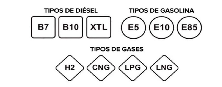 Las nuevas etiquetas serán de un cuadrado para el gasóleo, siendo identificados por la letra B para el biodiésel y XTL para le derivado del crudo, mientras que la gasolina será un circulo y la letra E, dejando un rombo a los combustibles gaseosos.