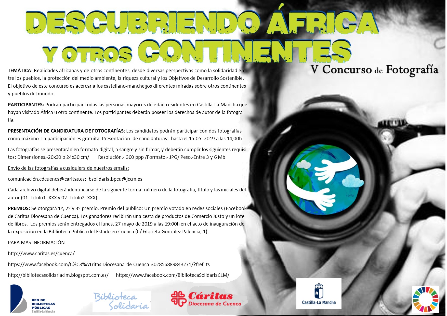 Con motivo de la conmemoración del Día de África, el próximo 25 de mayo, Cáritas Diocesana de Cuenca y el Programa de Biblioteca Solidaria de Castilla-La Mancha organizan el V Concurso de Fotografía “Descubriendo África y otros continentes” en Castilla-La Mancha que ha ampliado su plazo de presentación de candidaturas hasta el próximo miércoles, 15 de mayo.