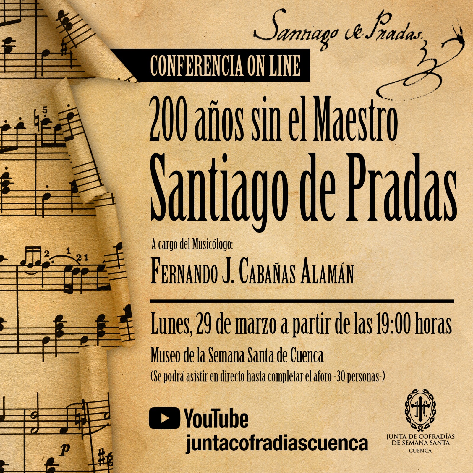 La Junta de Cofradías organiza el próximo lunes, 29 de marzo, la conferencia ‘200 años sin el maestro Santiago de Pradas’, a cargo del musicólogo Fernando J. Cabañas Alamán. La conferencia se podrá seguir tanto de forma presencial en la Sala Marco Pérez de la sede de la Junta de Cofradías como de forma virtual a través del canal de youtube de la institución (https://www.youtube.com/user/juntacofradiascuenca/videos).