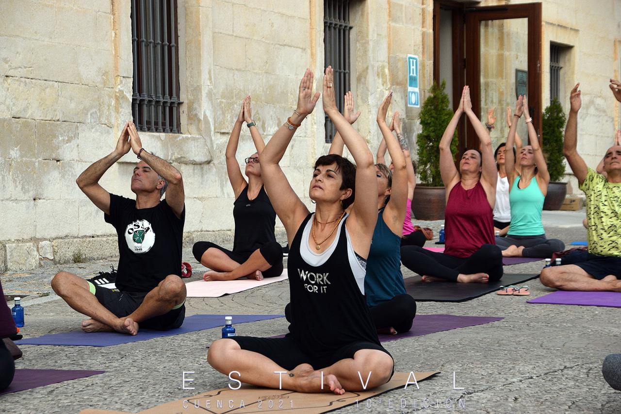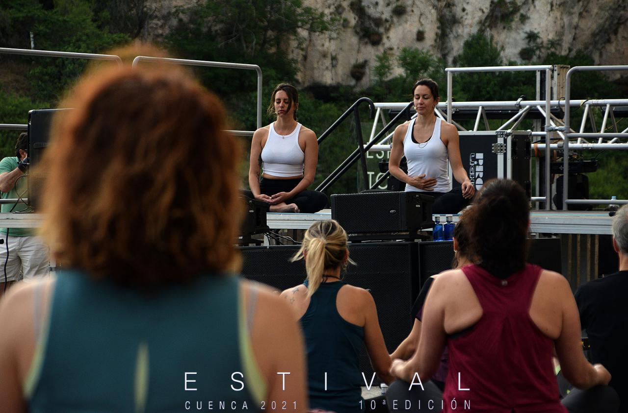 El yoga volvió a contar con su espacio único e inigualable en Estival Cuenca por un año más. El festival conquense sigue apostando por esta propuesta innovadora y tranquila que convierte su escenario habitual de conciertos en una masterclass de esta disciplina espiritual, otorgando a los participantes un entorno único con la Hoz del Huécar y el casco antiguo conquense, Patrimonio del Humanidad, como trasfondo.