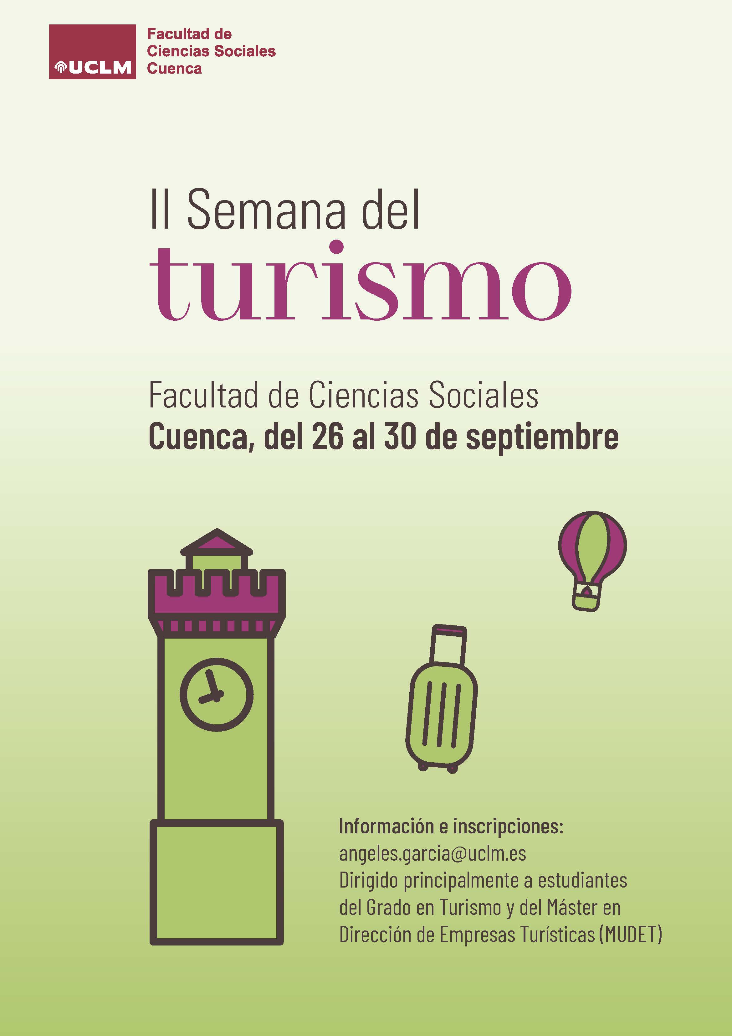 La Facultad de Ciencias Sociales de la Universidad de Castilla-La Mancha (UCLM) en el Campus de Cuenca celebrará entre el 26 y el 30 de septiembre la segunda edición de su Semana del Turismo, una iniciativa que pretende abordar el presente y el futuro de esta industria, que supone aproximadamente el siete por ciento del PIB de la región.