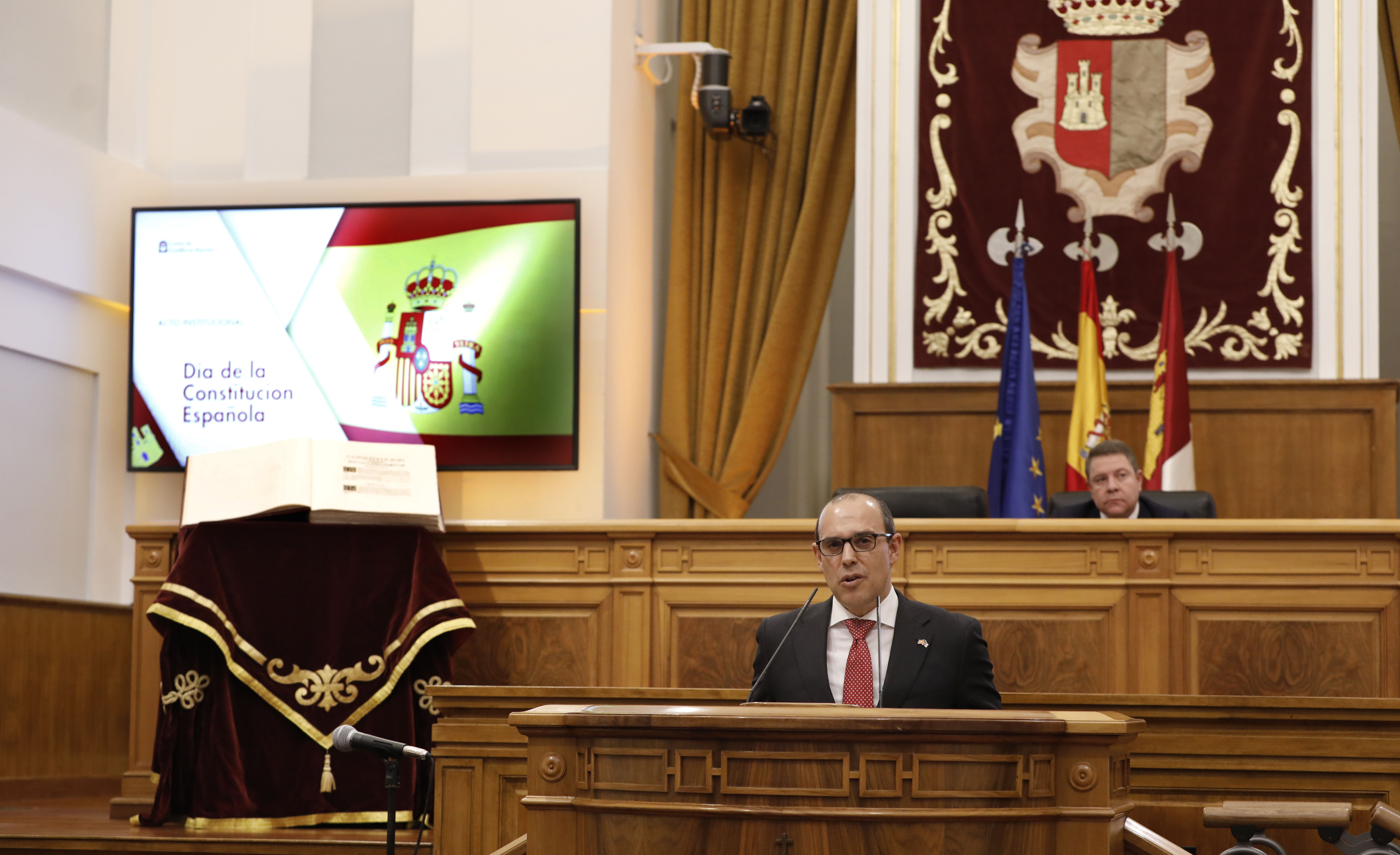 El presidente de las Cortes regionales ha hecho estas reflexiones durante su discurso del acto institucional con motivo del Día de la Constitución Española en Castilla-La Mancha, organizado un año más por el parlamento, celebrado en su sede del Convento de San Gil de Toledo y presidido por el presidente de Castilla-La Mancha, Emiliano García-Page.