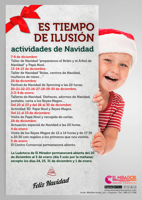 Por último, cabe destacar la cesión de un espacio para la protectora Cuencanimal, que contará con un stand de concienciación y mercadillo solidario tanto el sábado día 21 como el domingo día 22 de diciembre, fecha de apertura del Centro Comercial El Mirador.