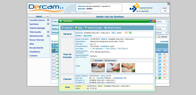 Finalmente, el programa cuenta con un módulo de quirófano que permite la gestión de la historia quirúrgica. Además, el libro de quirófano permite al dermatólogo almacenar y gestionar todos los pacientes que se encuentran pendientes de citar para quirófano, los que se encuentran ya citados y, por último, los que ya han sido operados.